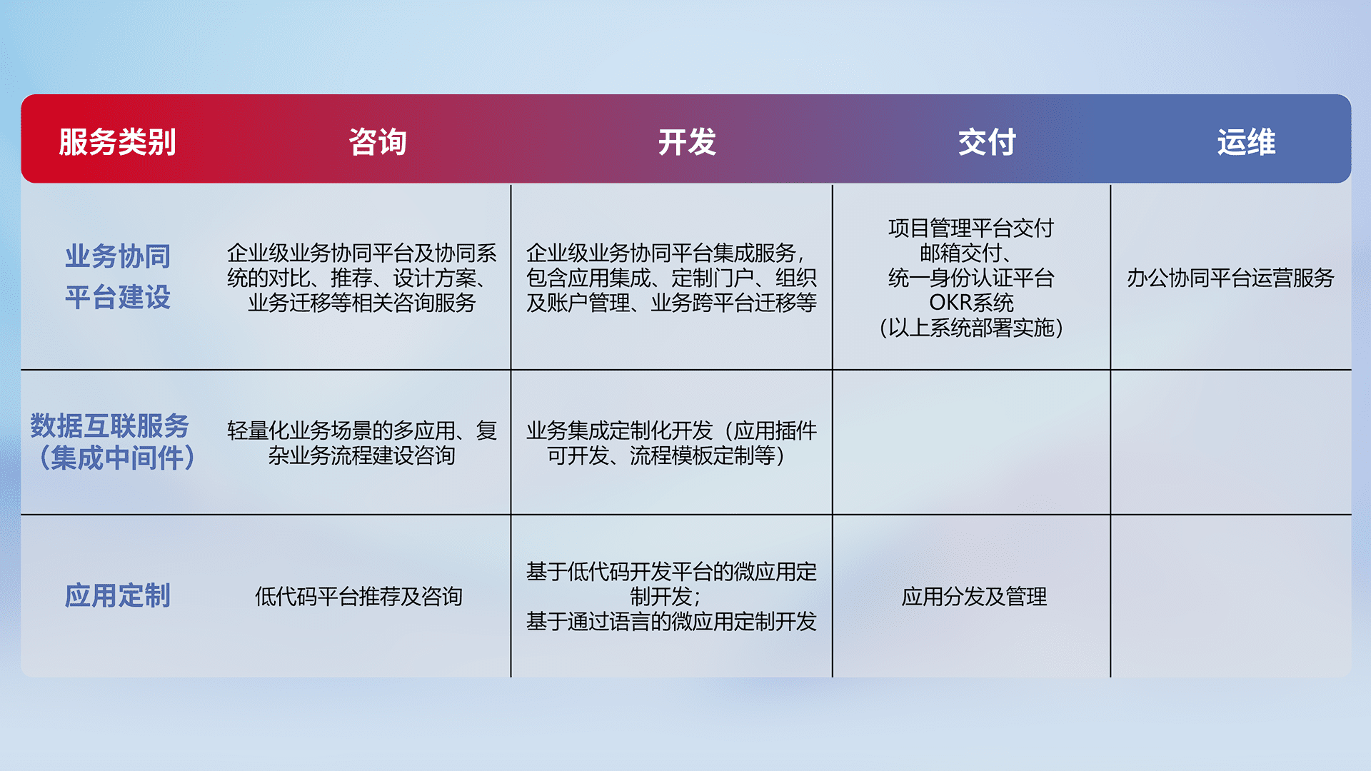 针对钉钉、、、、企微、、、IDaas等平台级产品提供产品的规划、、、方案、、、、交付、、、、定制化开发等服务,,,实现如统一协同办公、、智能客户服务、、、混合会议管理、、智能数据查询、、等业务场景,,,,实现数字化转型。。。。